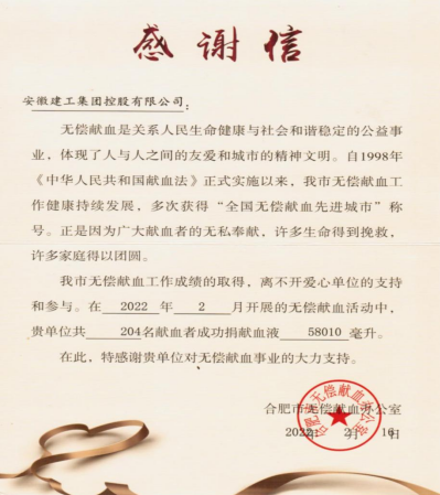 2月10日獻(xiàn)血倡議發(fā)起,集團(tuán)各級(jí)工會(huì)組織積極響應(yīng),廣泛宣傳,短短一天就有近300名職工踴躍報(bào)名參加。獻(xiàn)血當(dāng)天分別設(shè)立了安建國(guó)際大廈獻(xiàn)血點(diǎn)和安徽三建獻(xiàn)血點(diǎn),共計(jì)204名職工成功獻(xiàn)血共計(jì)58010毫升,助力了合肥市血站確保北京冬奧會(huì)血液調(diào)配保障任務(wù)的完成,彰顯了建工職工無(wú)私奉獻(xiàn)、積極向上、勇?lián)鐣?huì)責(zé)任的良好品格。