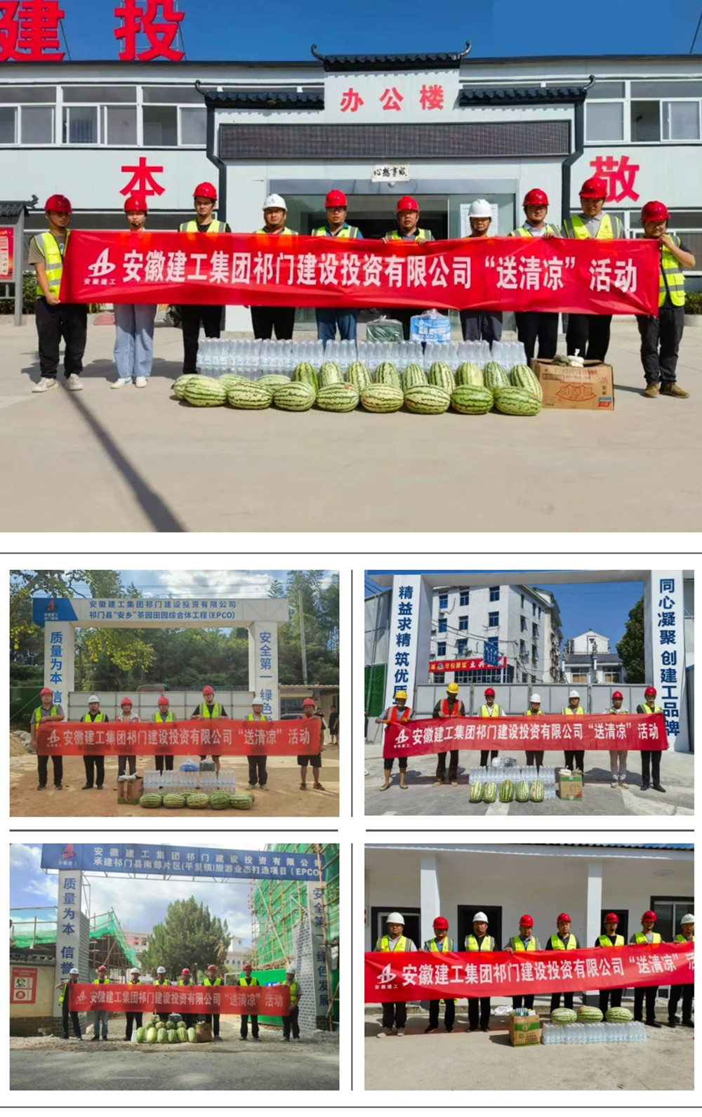在F012塔坊至平里公路改建工程項目、“安鄉(xiāng)”茶園田園綜合體工程項目、南部片區(qū)(平里鎮(zhèn))旅游業(yè)態(tài)打造項目、祁門經濟開發(fā)區(qū)低碳科創(chuàng)園基礎設施項目、電商物流產業(yè)園項目、梅城大廈建設工程項目的施工現(xiàn)場祁門建投領導班子為一線工作人員送去綠豆、人丹、十滴水、西瓜、礦泉水等防暑降溫物品,對高溫下堅守一線的員工表示誠摯的慰問和衷心的感謝,叮囑大家要注意休息,提高自我保護意識。同時,要求項目管理團隊要認真落實好防暑降溫各項措施,備足備齊防暑降溫物資,守牢安全生產底線,合理安排工作時間,采取減少高溫時段室外作業(yè)、輪換作業(yè)、減輕勞動強度等措施,把防暑降溫工作落到實處,確保一線員工的身體健康和施工生產安全有序推進。