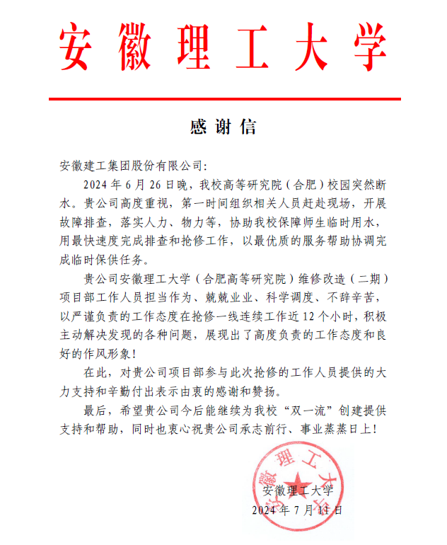 近日,安徽建科總承包分院收到安徽理工大學感謝信,對安徽理工大學(合肥高等研究院)維修改造(二期)項目部在校園夜間突發(fā)斷水搶修過程中提供的大力支持和辛勤付出表示感謝。