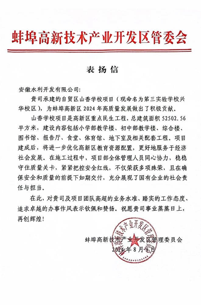 近日,安徽水利山香學校項目獲蚌埠高新區(qū)管委會來信表揚,對項目團隊在建設(shè)過程中付出的努力和取得的成績給予高度評價。