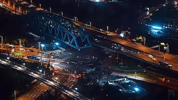 該橋位斜穿日均車流量5萬余輛的楊高北路與港城路十字路口,上空受500KV超高壓走廊凈空限制,地下176處重要管線縱橫交錯(cuò),導(dǎo)致傳統(tǒng)施工方法完全無法適配。建工智能制造針對(duì)復(fù)雜城市環(huán)境,創(chuàng)新采用“異位支架拼裝+SPMT智能整體移運(yùn)+精確落梁調(diào)整”移運(yùn)方案。10月25日夜間,在SPMT智能移運(yùn)系統(tǒng)的精準(zhǔn)操控下,“鋼鐵巨龍”平穩(wěn)移動(dòng),以毫米級(jí)的控制精度精準(zhǔn)就位,作業(yè)時(shí)間被嚴(yán)格控制在8小時(shí)以內(nèi),真正實(shí)現(xiàn)“一夜飛跨”的建設(shè)奇跡。