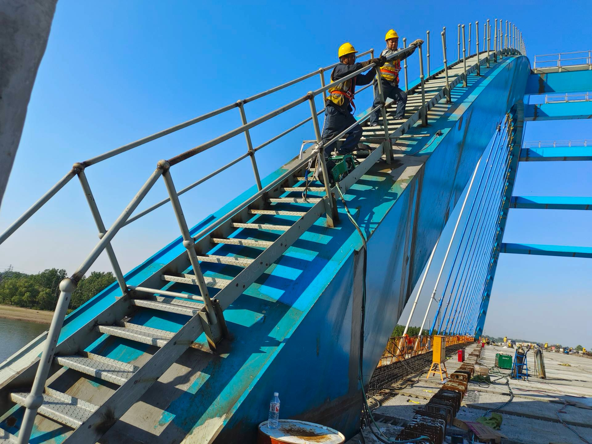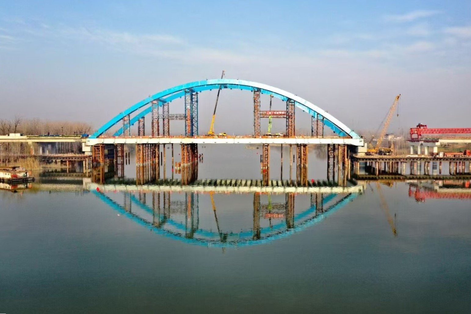截至目前,大橋主體結(jié)構(gòu)、橋面鋪裝、主跨主梁安裝、主跨拱橋預(yù)制橋面板安裝任務(wù)已全部完成,正在緊張有序地進(jìn)行主橋現(xiàn)澆濕接縫作業(yè)。在開展橋面鋪裝和主跨拱橋安裝施工過程中,項(xiàng)目團(tuán)隊(duì)運(yùn)用高精度的測量儀器、先進(jìn)的吊裝設(shè)備,精準(zhǔn)控制、精確安裝,確保各項(xiàng)工作達(dá)標(biāo)、安全、高效。