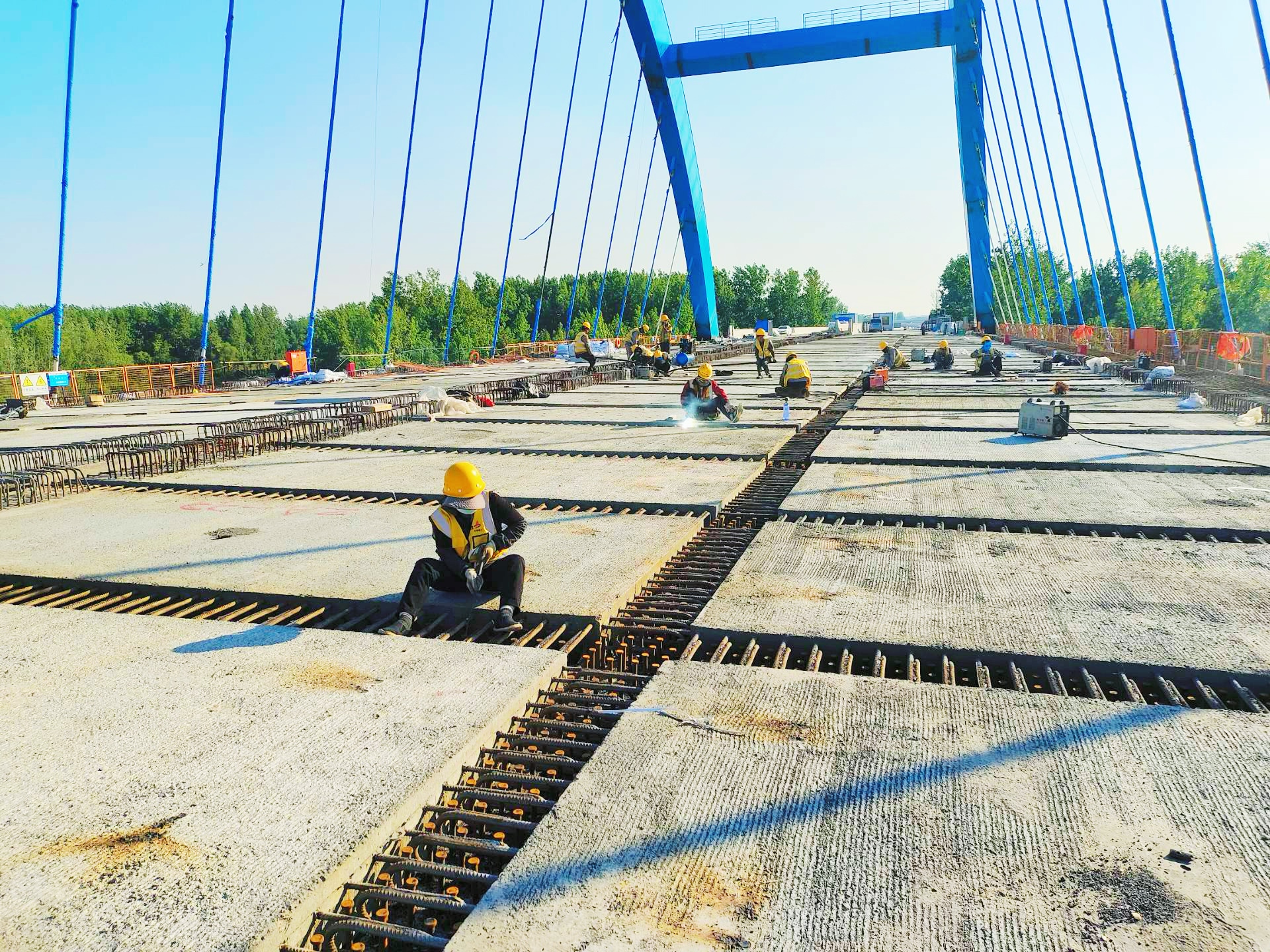 為確保5月底實(shí)現(xiàn)大橋全線竣工,20余名作業(yè)人員實(shí)行24小時(shí)全天候輪值施工,同步推進(jìn)引橋橋面鋪裝、吊桿張拉、主橋橋面板鋪裝、橋面系澆筑以及護(hù)欄安裝等多項(xiàng)作業(yè)任務(wù)。