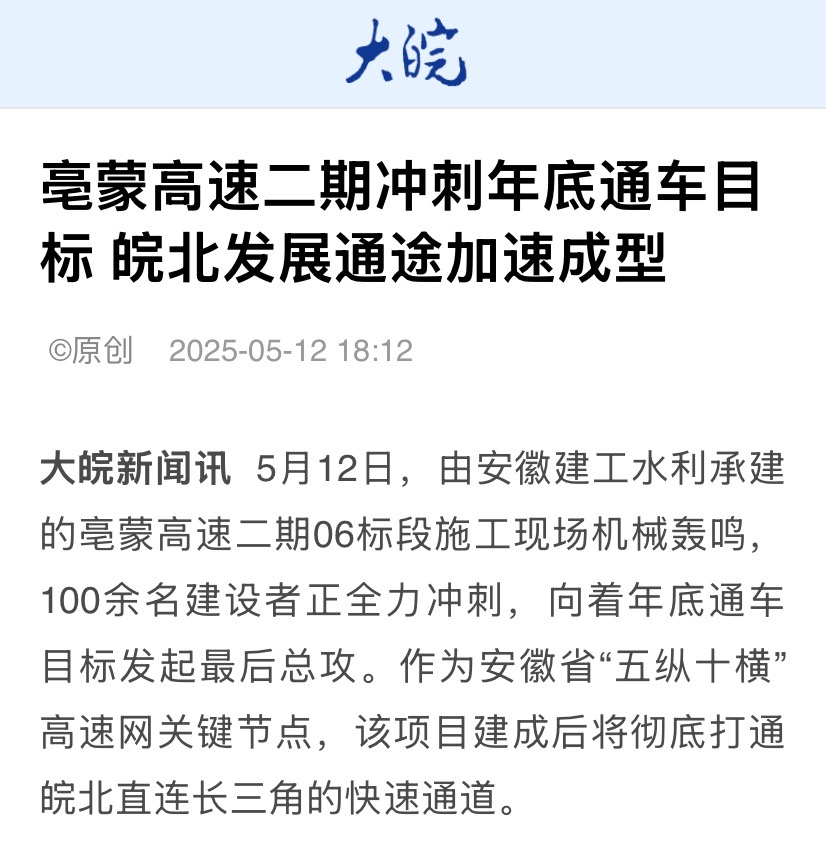 5月12日,建工水利亳蒙高速二期06標(biāo)施工現(xiàn)場機(jī)械轟鳴,100余名建設(shè)者正夜以繼日、全力沖刺,向著年底全線通車目標(biāo)發(fā)起最后總攻。作為安徽省“五縱十橫”高速網(wǎng)關(guān)鍵節(jié)點(diǎn),項(xiàng)目建成后將徹底打通皖北直連長三角的快速通道。此前,該項(xiàng)目建設(shè)期間,多次受到安徽日報(bào)、大皖新聞、中安在線等主流媒體關(guān)注報(bào)道。