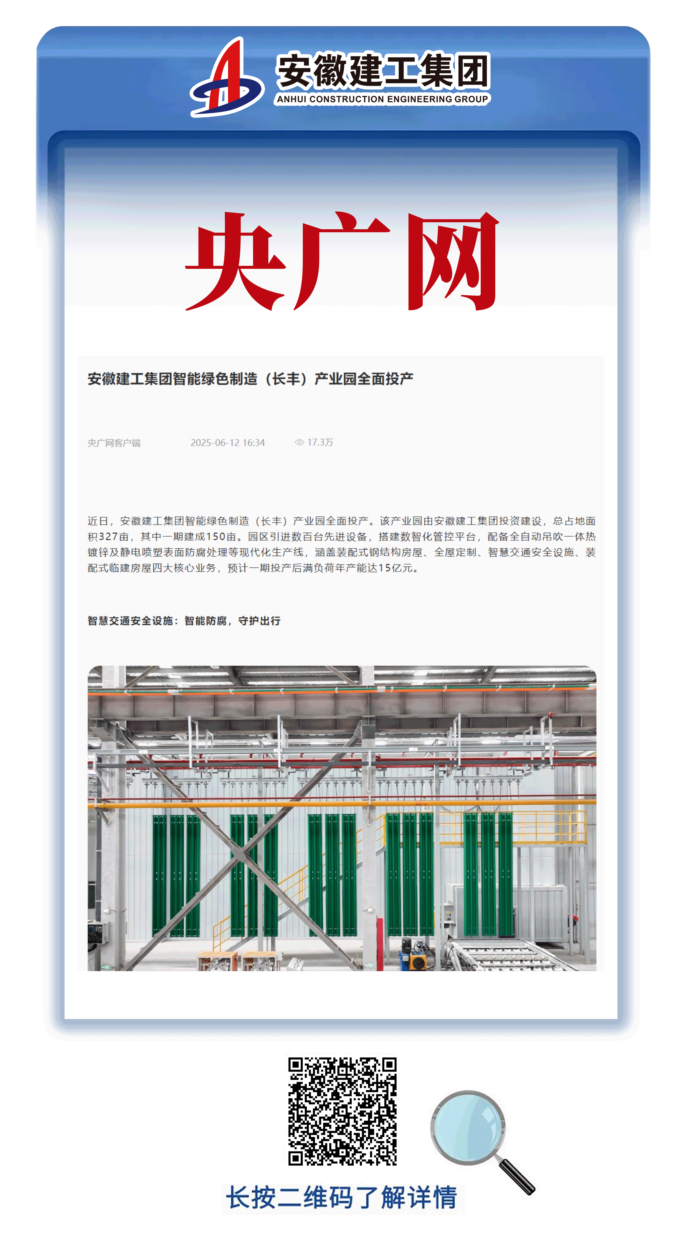 近日,安徽建工集團(tuán)智能綠色制造(長(zhǎng)豐)產(chǎn)業(yè)園正式開園并全面投產(chǎn),這一轉(zhuǎn)型發(fā)展成果引發(fā)人民網(wǎng)、央廣網(wǎng)、安徽日?qǐng)?bào)等多家主流媒體的廣泛關(guān)注與深度報(bào)道。各大媒體從產(chǎn)業(yè)創(chuàng)新、技術(shù)突破、綠色發(fā)展等多個(gè)維度,對(duì)產(chǎn)業(yè)園進(jìn)行了全方位解讀,展現(xiàn)了安徽建工集團(tuán)在智能制造領(lǐng)域的突出發(fā)展成就。
